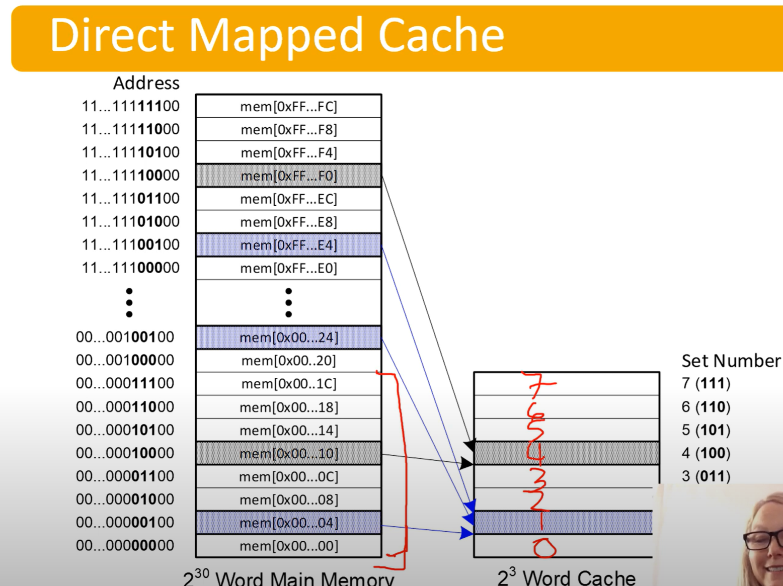 - Look at the highlighted memory address to see which word (word size here is 8 bit I think?) maps to which location in the cache.