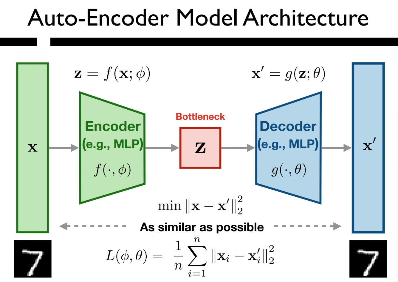 - Loss Function: minimize the difference between x and xβ, so as to train the encoder and decoder concurrently