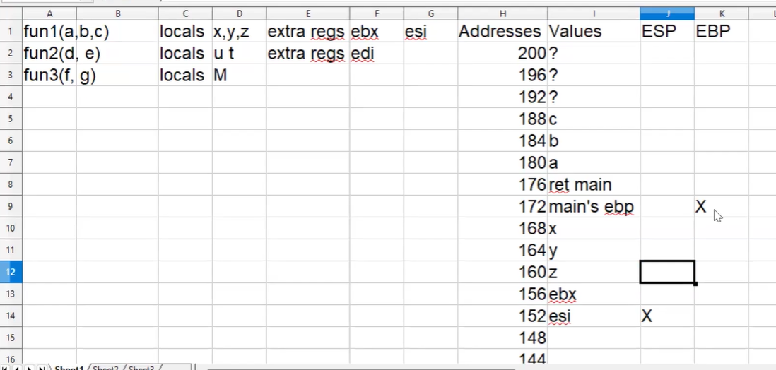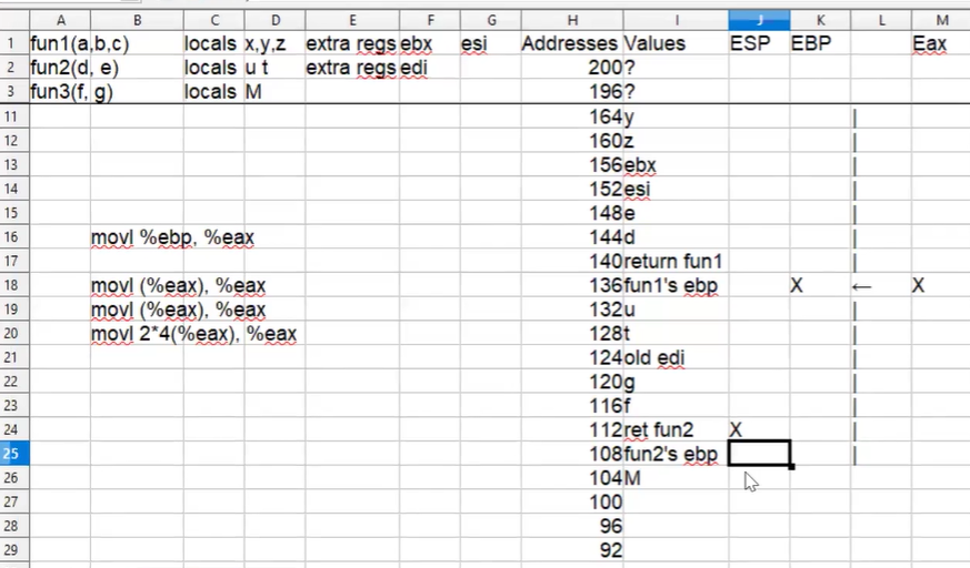 movl (%eax), %eax // following the ebp pointer (fun3->fun2)