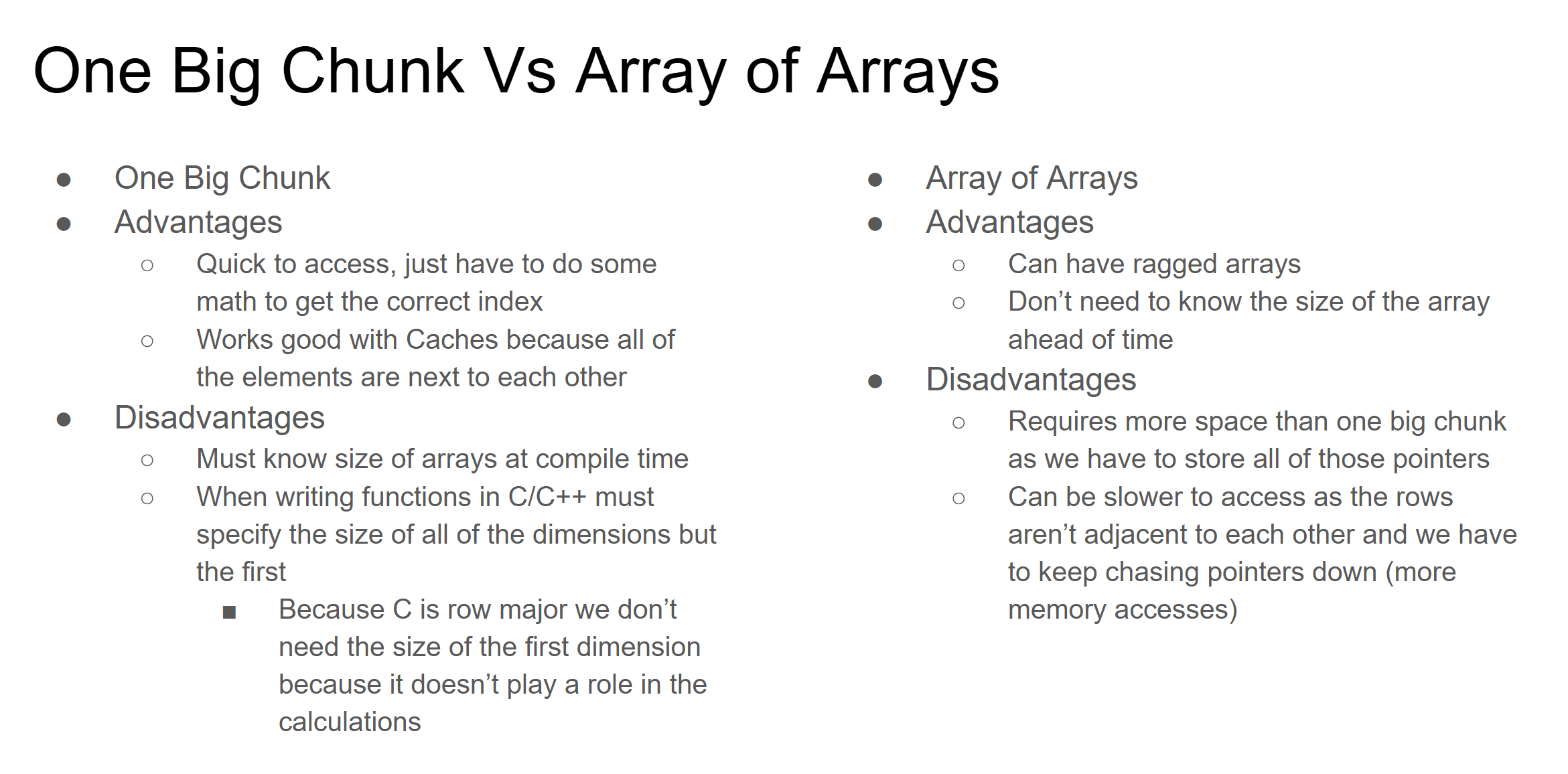 - A 4x5x6 array uses 17% of space for pointers. (4 arrays pointing to 5 arrays of 6 ints)