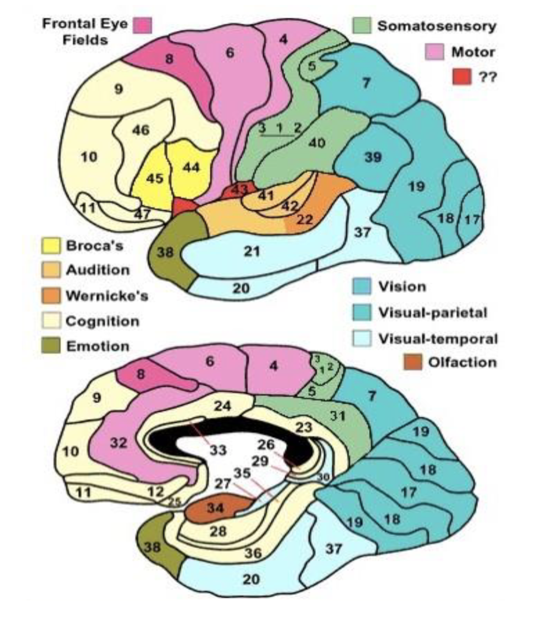 - Yellow: Broca’s Area. BA44, BA45