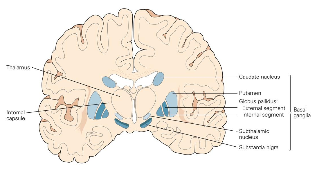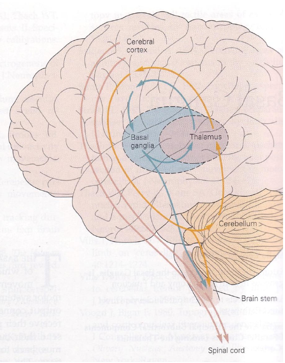 BG does not have direct connections with the spinal cord and are therefore considered to be part of the “extrapyramidal” motor system