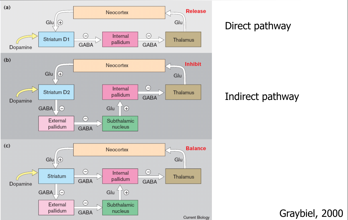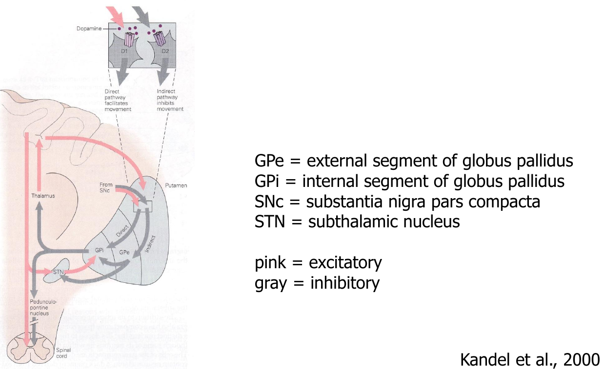 Imbalance between the direct and indirect pathway seems to cause problems: - Overactivity in indirect pathway -> hypokinetic disorders (like Parkinsons disease)
