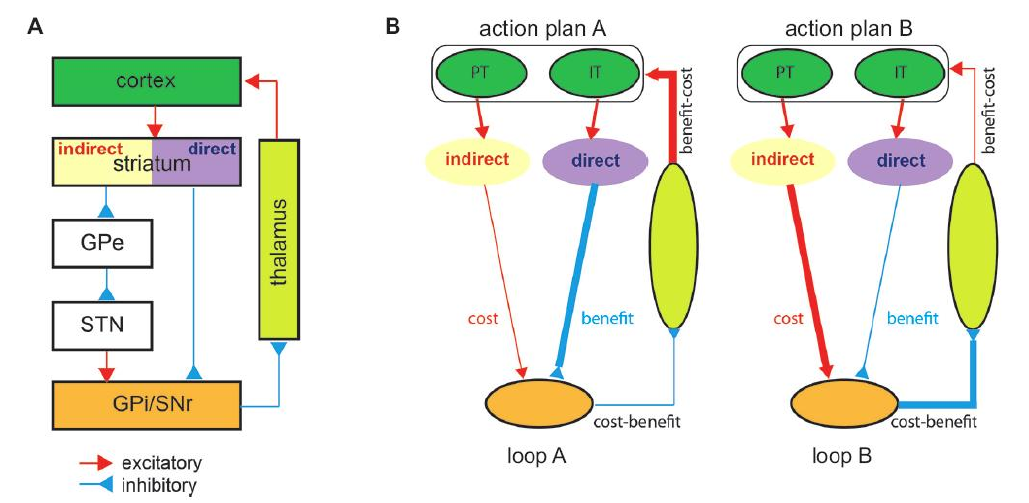 According to the cost-benefit dependent action selection model, the direct pathway evaluates the potential benefits of potential actions (plasticity in the direct pathway is thought to be mainly driven by dopamine bursts), whereas the indirect pathway evaluates the potential costs associated with potential actions (plasticity in the indirect pathway is thought to be mainly driven by dopamine dips deriving either from omissions of expected rewards or from punishments). A signal reflecting the outcome of a cost-benefit comparison is sent back to cortex: