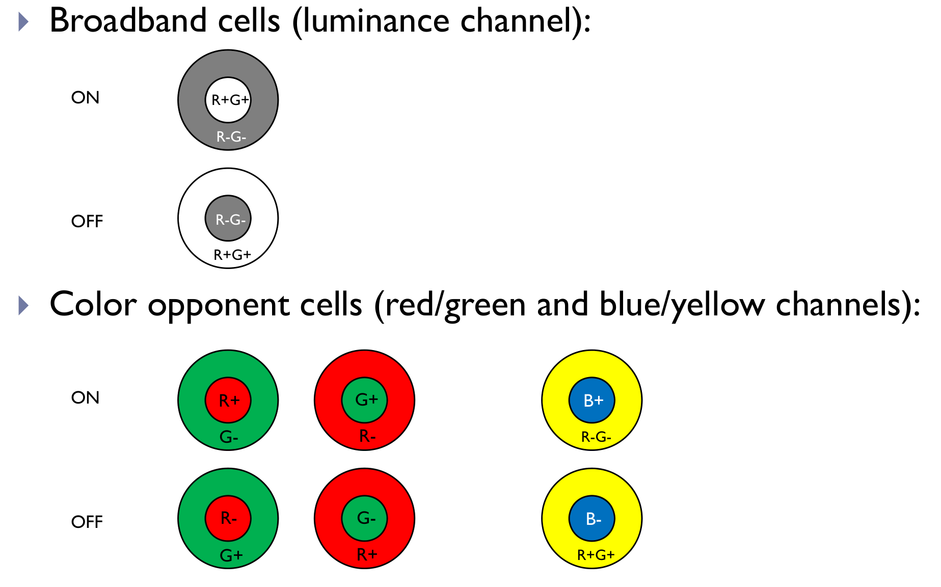 - Spectral properties (broadband vs. color opponent)