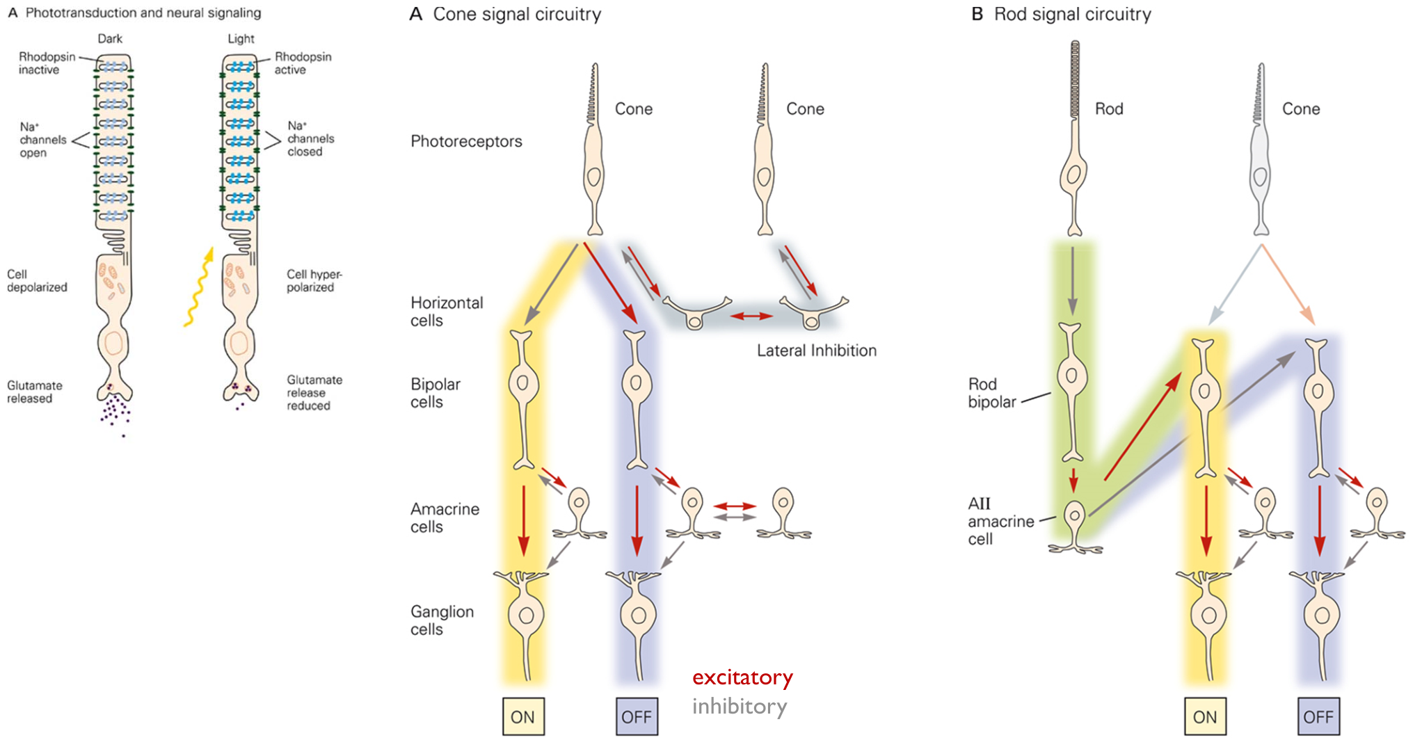 - In light, rhodopsin activates, Na+ channels close, cell hyperpolarizes and glutamate release is reduced