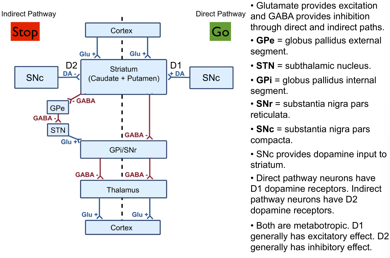 - Specifics of basal ganglia circuits as discussed in class.