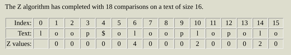 With the example: P=“loop”, T=“oplopolo”, the Z-Algorithm will match on the text: I=“loop$olooplopolo”.