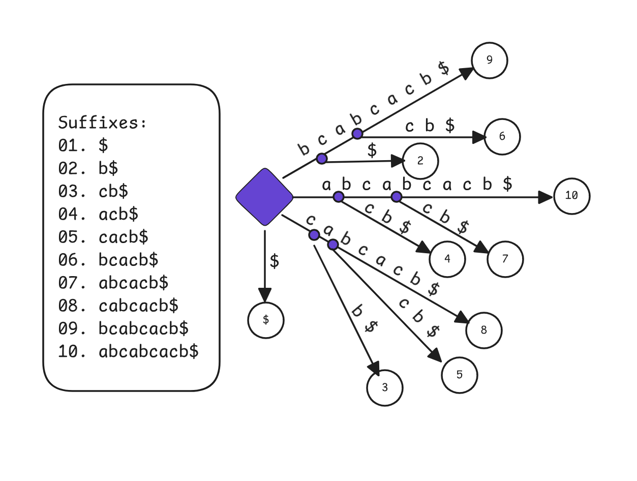 - Build a suffix tree (using Ukkonen’s algorithm is