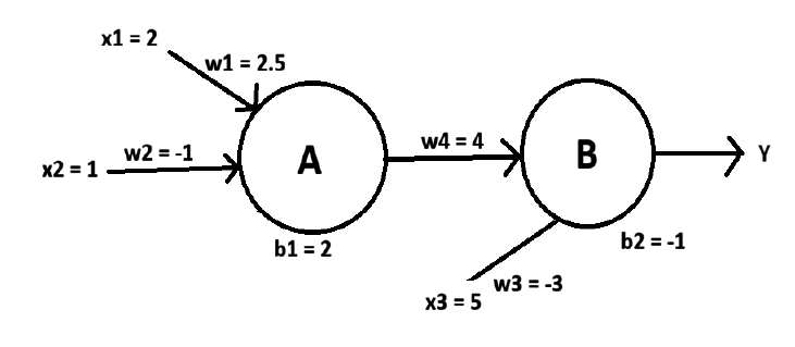 The notebook set up a two neuron network and asked you to draw a picture of the two neuron network showing the inputs, weights, and who is connected to whom. Draw that picture below.