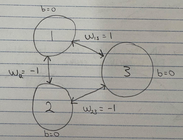 - Consider a Hopfield network with 3 neurons. The weights are w12 =−1, w13 = +1 and w23=-1. The biases are all 0.