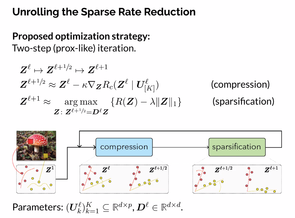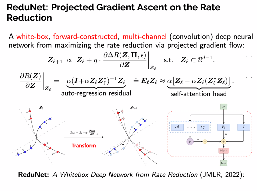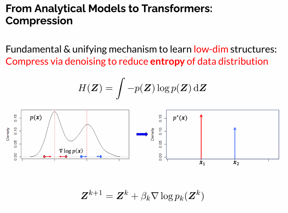 In this talk, we contend that a natural objective of representation learning is to compress and transform the distribution of the data, say sets of tokens, towards a low-dimensional Gaussian mixture supported on incoherent subspaces. The goodness of such a representation can be evaluated by a principled measure, called sparse rate reduction, that simultaneously maximizes the intrinsic information gain and extrinsic sparsity of the learned representation. From this perspective, popular deep network architectures, including transformers, can be viewed as realizing iterative schemes to optimize this measure. Particularly, we derive a transformer block from alternating optimization on parts of this objective: the multi-head self-attention operator compresses the representation by implementing an approximate gradient descent step on the coding rate of the features, and the subsequent multi-layer perceptron sparsifies the features. This leads to a family of white-box transformer-like deep network architectures, which we call CRATE, which are mathematically fully interpretable. Experiments show that these networks, despite their simplicity, indeed learn to compress and sparsify representations of large-scale real-world image and text datasets, and achieve performance close to highly engineered transformer-based models, including ViT and GPT2.