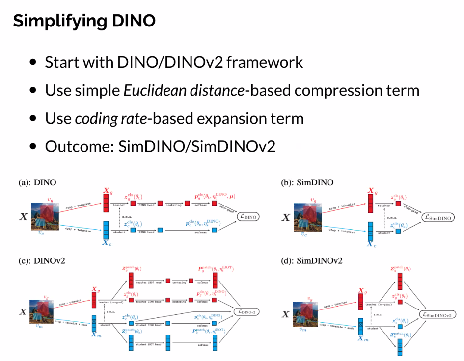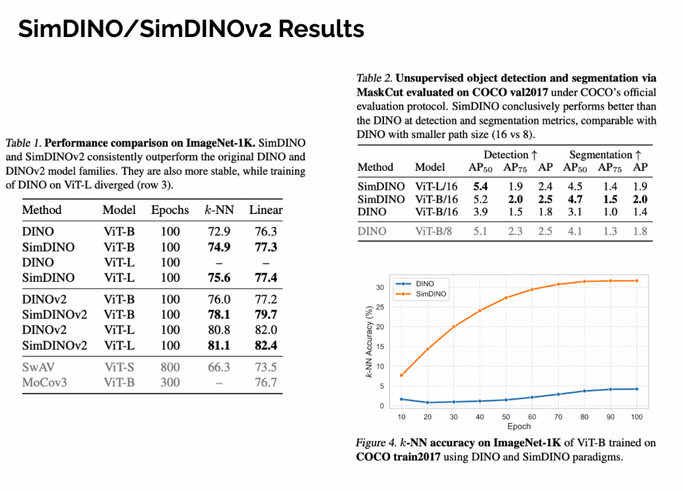 - Resulting methods can be significantly better and more stable than previous work (e.g. SimDINO).